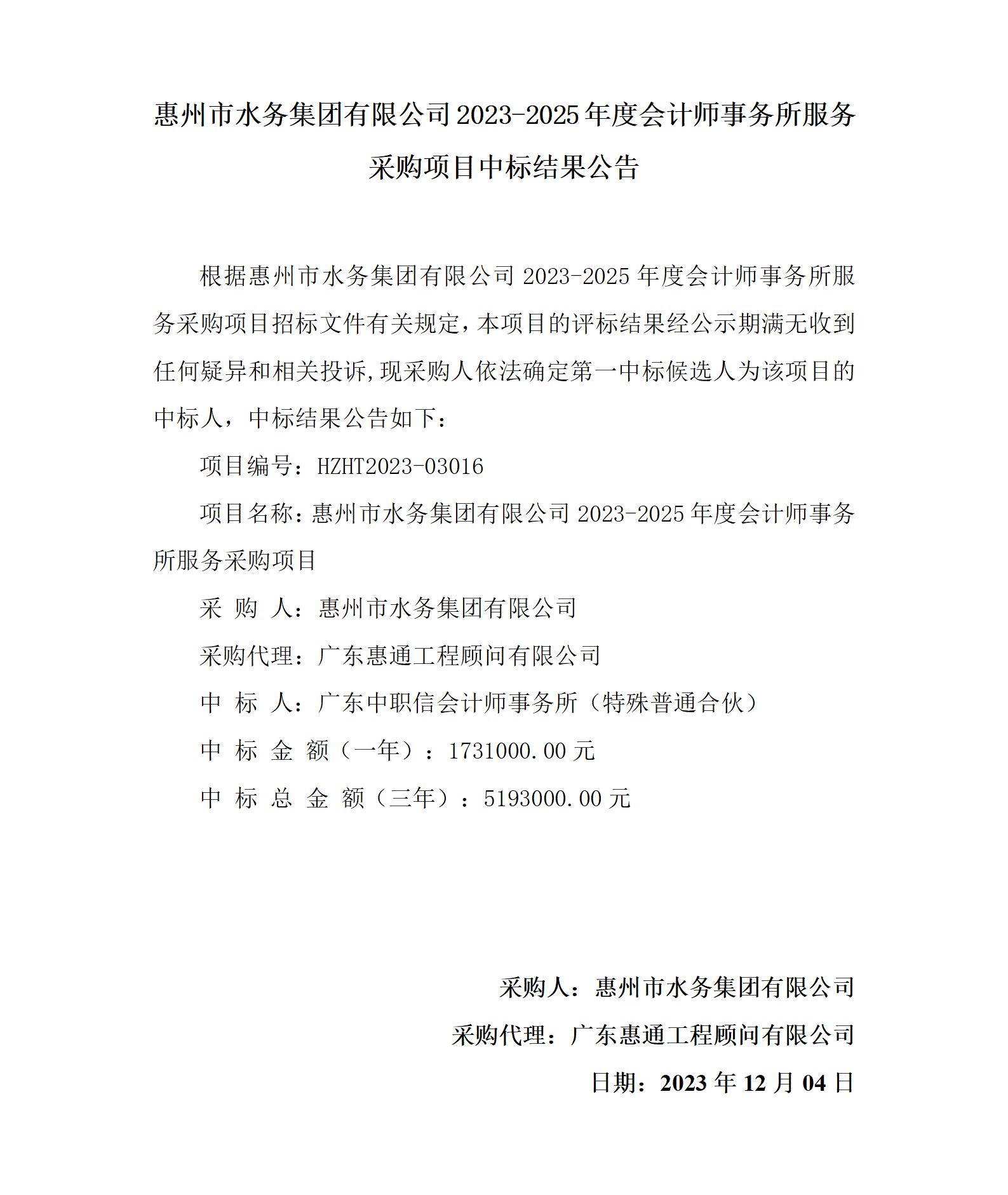 惠州市水務(wù)集團有限公司2023-2025年度會計師事務(wù)所服務(wù)采購項目中標結(jié)果公告.pdf