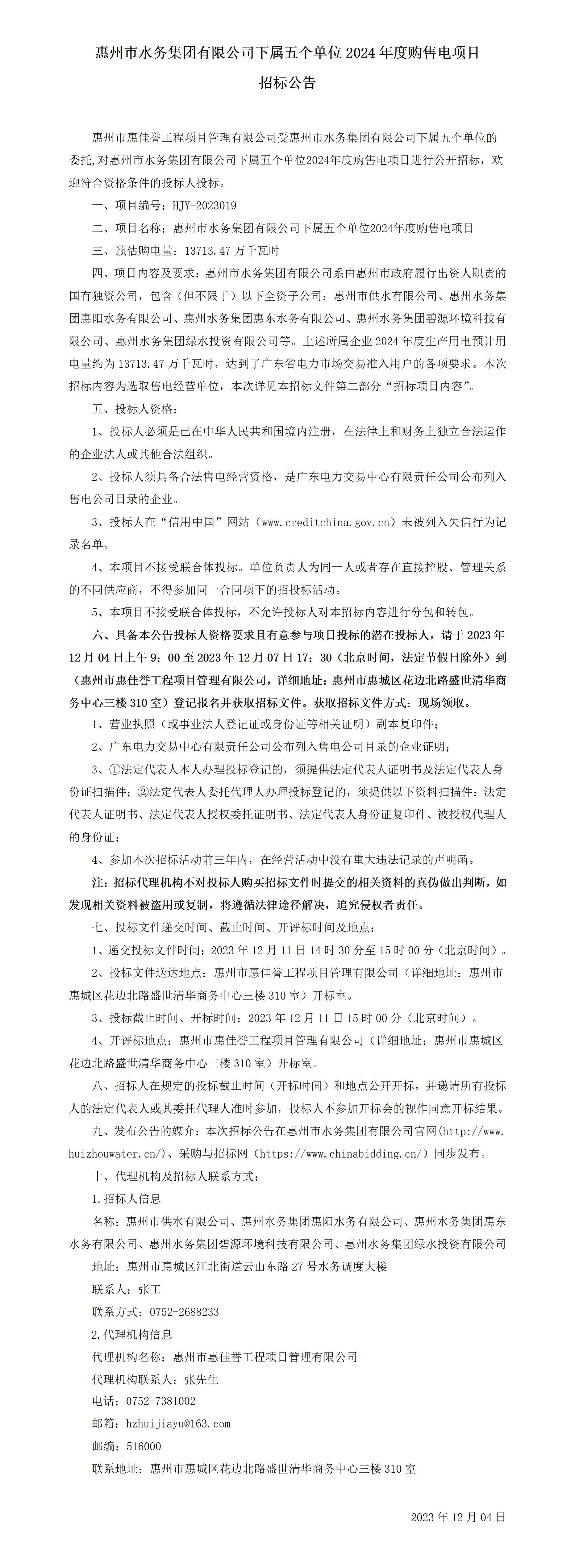 惠州市水務(wù)集團有限公司下屬五個單位2024年度購售電項目招標公告.pdf